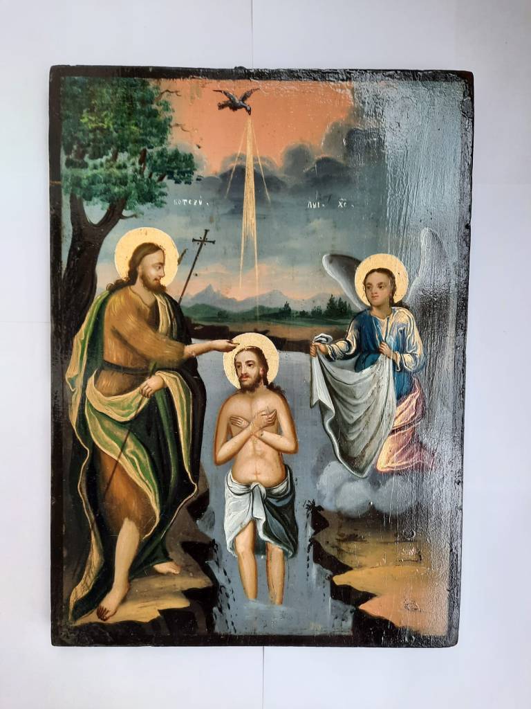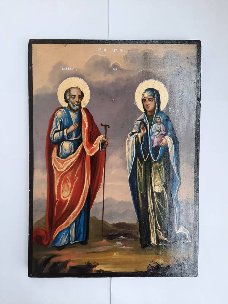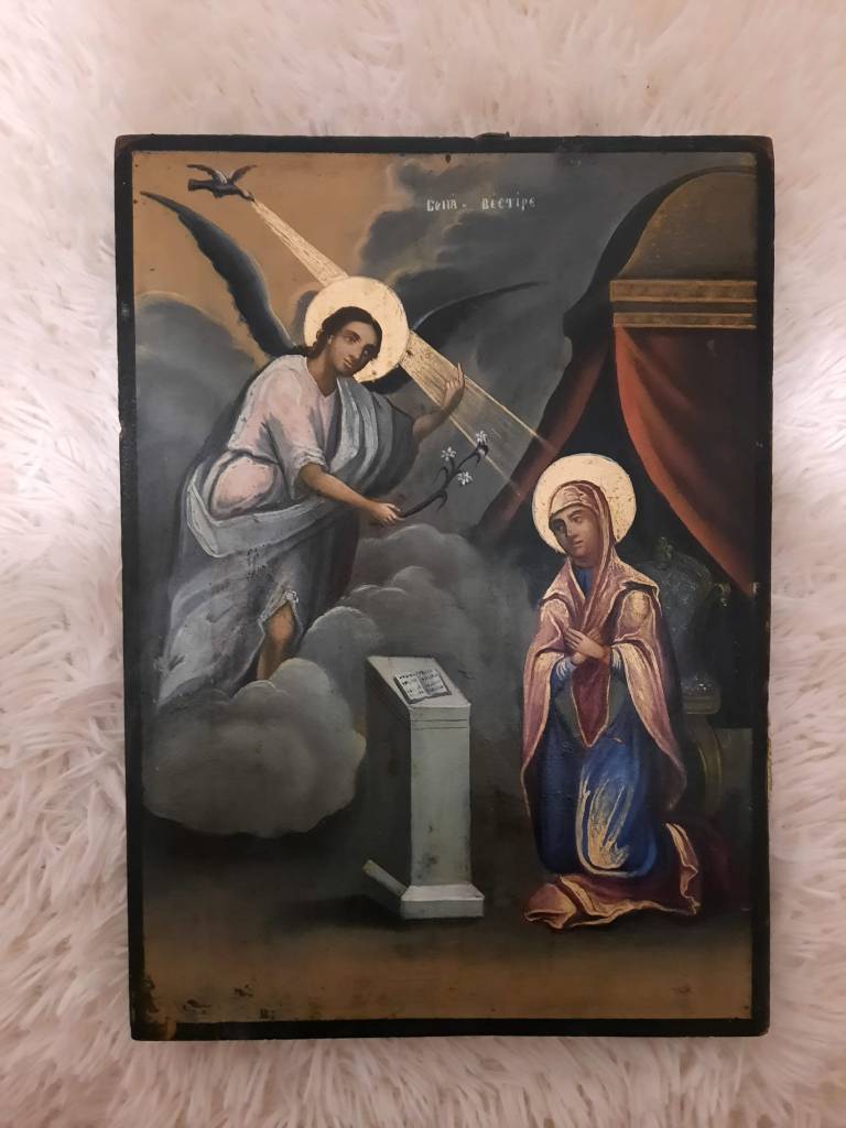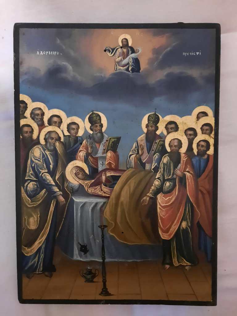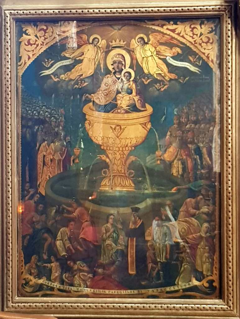 , icoana pictata de Nae Pantelimonescu in anul 1862. Daruita Bisericii Lucaci de breasla cofetarilor. La baza acesteia apare blazonul Principatelor Romane.